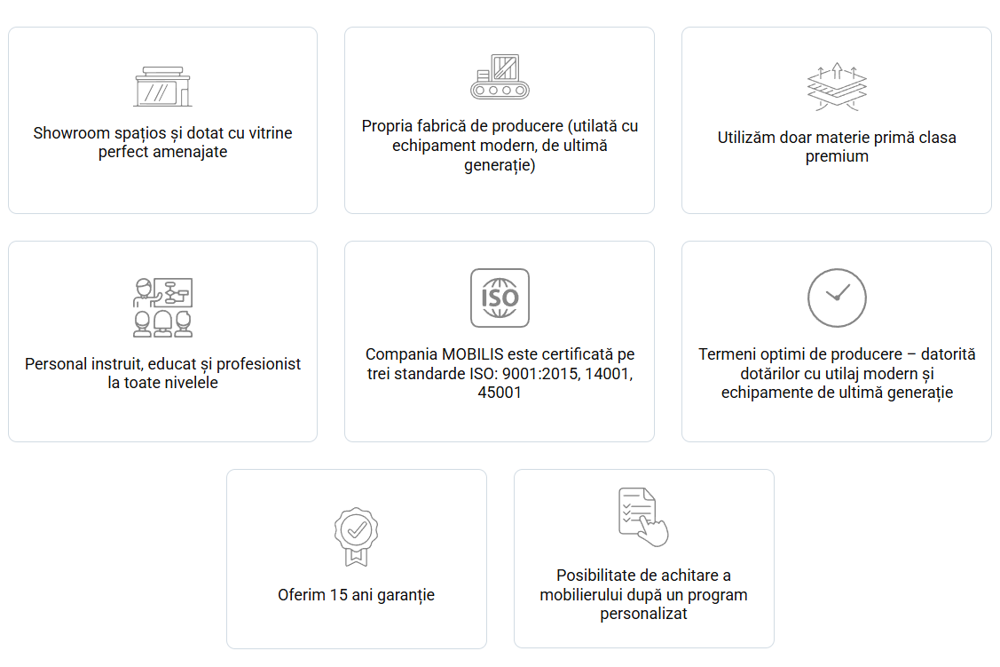 Cu peste 10 ani de experiență, Mobilis produce mobilier personalizat pentru locuințe și spații comerciale. Oferim soluții estetice și funcționale, realizate din materiale premium și tehnologii avansate. Asigurăm servicii complete – de la design la montaj – și garanție extinsă, reflectând angajamentul nostru pentru excelență, certificat ISO.