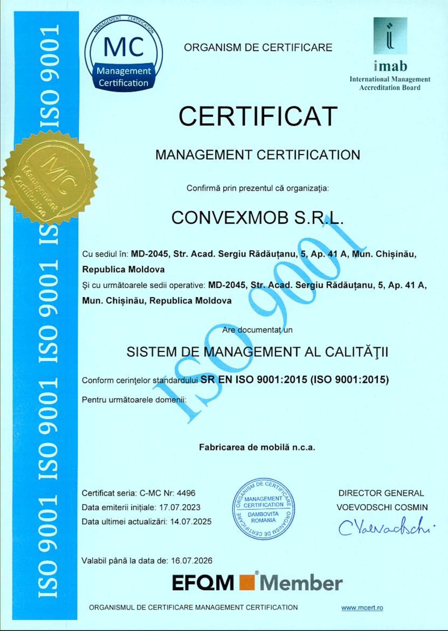 Certificare pentru sistemul de management al calității, aplicabil activității de fabricare a mobilei.
