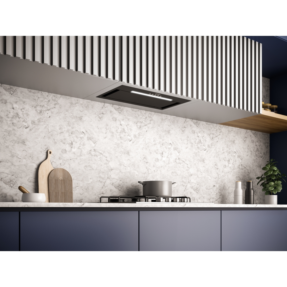 • Cu un design plat și un cadru subțire de 5 mm, aceste hote in finisaj matte black se potrivesc perfect în orice bucătărie.