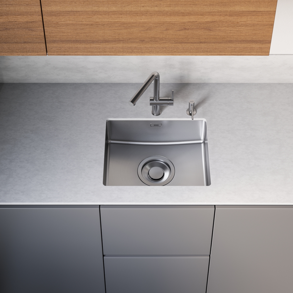 Подстольные чаши Maris Quiet из нержавеющей стали оснащены нашей невидимой системой шумоподавления Quiet Pad, которая снижает уровень шума до 20 дБ, а также большим 7-дюймовым вентилем с корзинкой-фильтром для отходов.