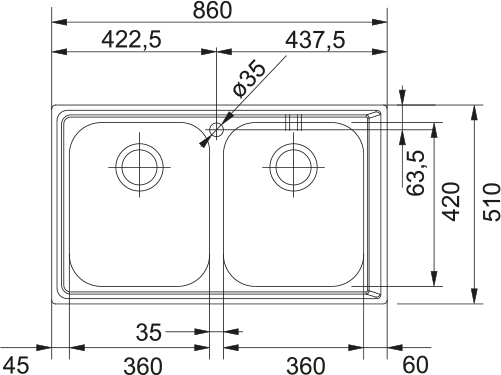 • Длина чаши (слева-направо): 360 мм